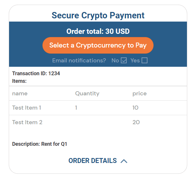 | items           | List of items in JSON format                                   | { "1": { "name": "Test Item 1", "Quantity":"1", "price": 10 }, "2": { "name": "Test Item 2", "price": 20 } } |